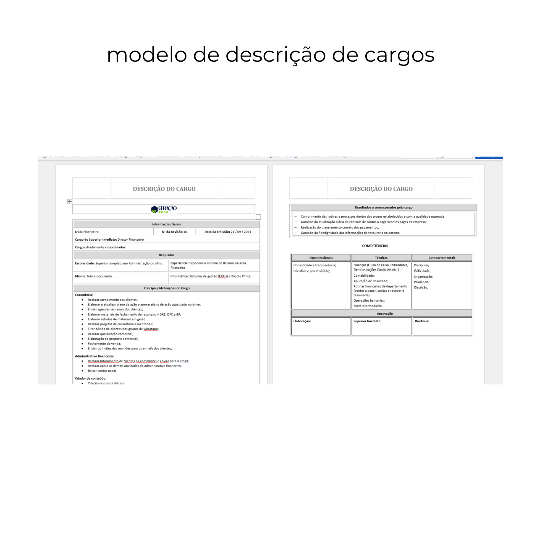 Estruture as responsabilidades e expectativas dos cargos dentro da empresa do seu cliente, facilitando a gestão de pessoas e o alinhamento de equipes.